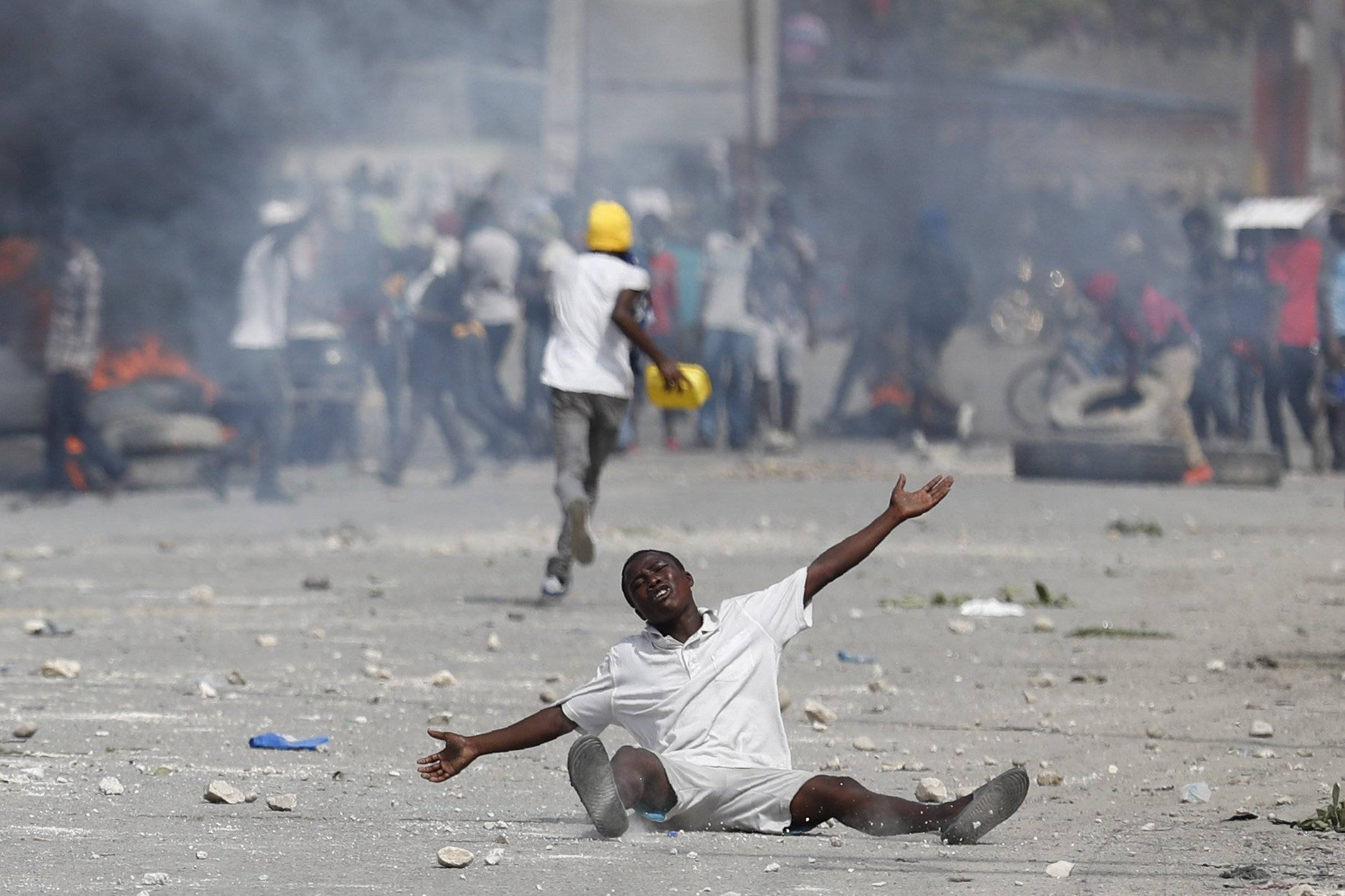 En esta imagen del 4 de octubre de 2019, un manifestante cae al suelo y pide ayuda a la policía, que disparó gases lacrimógenos para evitar que los manifestantes prosiguieran su marcha hacia a las instalaciones de las Naciones Unidas en Puerto Príncipe, Haití. Miles de manifestantes marcharon por la capital haitiana hacia las instalaciones de la ONU el viernes, en una de las protestas más importantes durante una semana de descontento, para exigir la salida del presidente Jovenel Moïse. (AP Foto/Rebecca Blackwell)