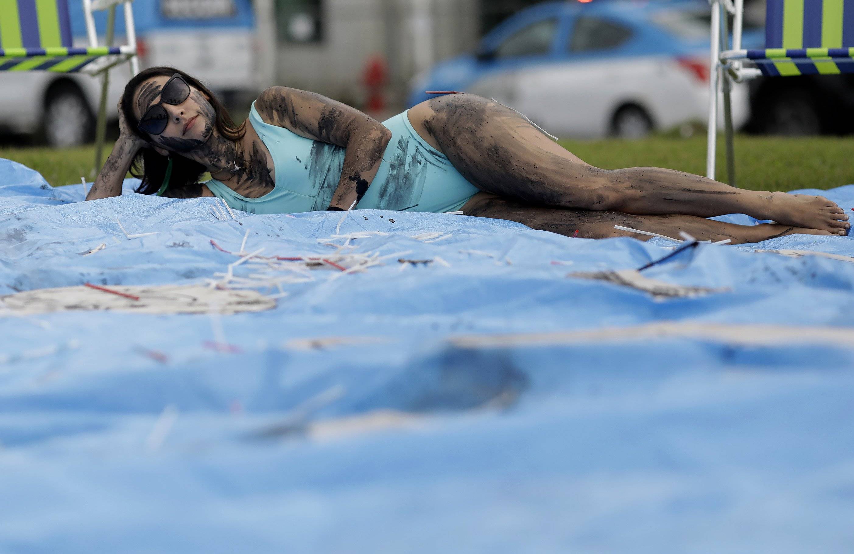 En esta imagen del 10 de octubre de 2019, una manifestante luce una pintura falsa para semejar petróleo durante una protesta en contra de la subasta para la exploración de yacimientos petroleros cerca de Abrolhos, una reserva nacional marítima en el estado de Bahía, frente al hotel Grand Hyatt, en donde se realiza la subasta en Río de Janeiro, Brasil. Debido a la presión de organizaciones medio ambientales, ninguna de las 17 compañías involucradas en el proceso presentó alguna oferta. (AP Foto/Silvia Izquierdo)