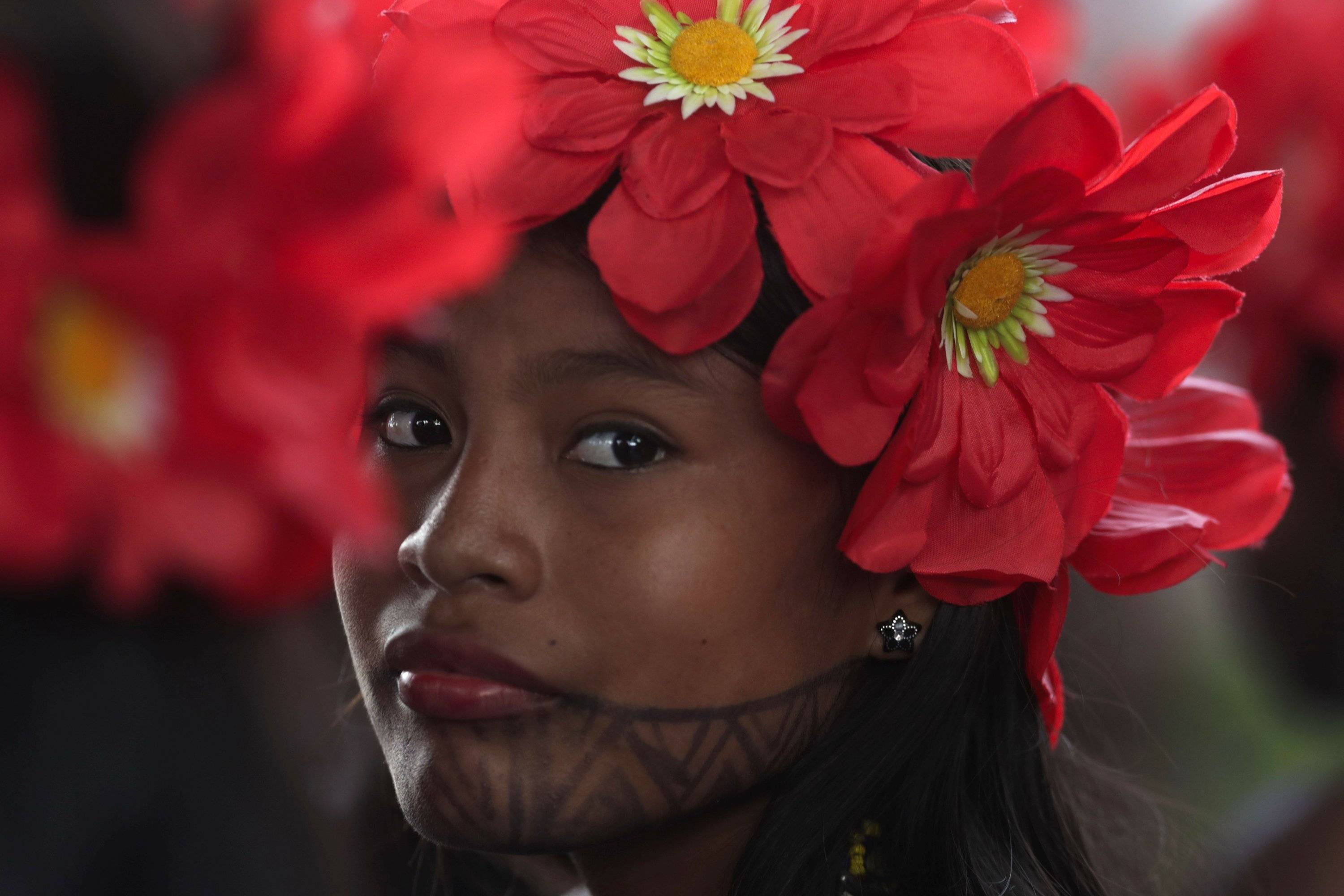 En esta imagen del 5 de octubre de 2019, una indígena embera utiliza un tocado floral en la cabeza a la espera de bailar para el presidente de Panamá Laurentino Cortizo, durante una gira de trabajo de comunidades locales en Yaviza, Panamá. (AP Foto/Arnulfo Franco)