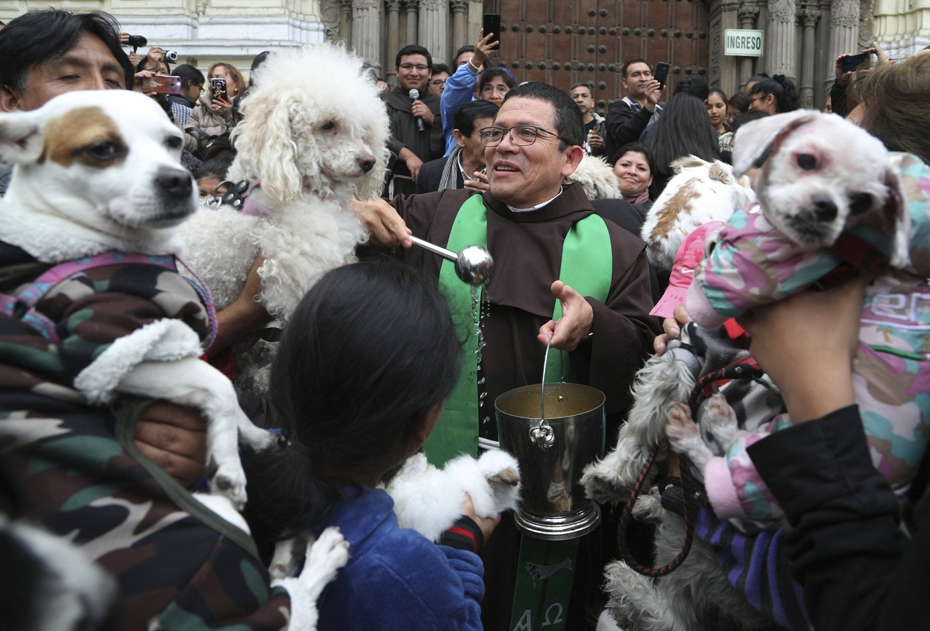 En esta imagen del 6 de octubre de 2019, el sacerdote católico Fermín Peña bendice a animales con agua bendita frente a la iglesia de San Francisco en Lima, Perú. El evento anual se realiza en honor de San Francisco, el santo patrono de los ecologistas, y quien es reconocido por su amor a los animales. (AP Foto/Martín Mejía)