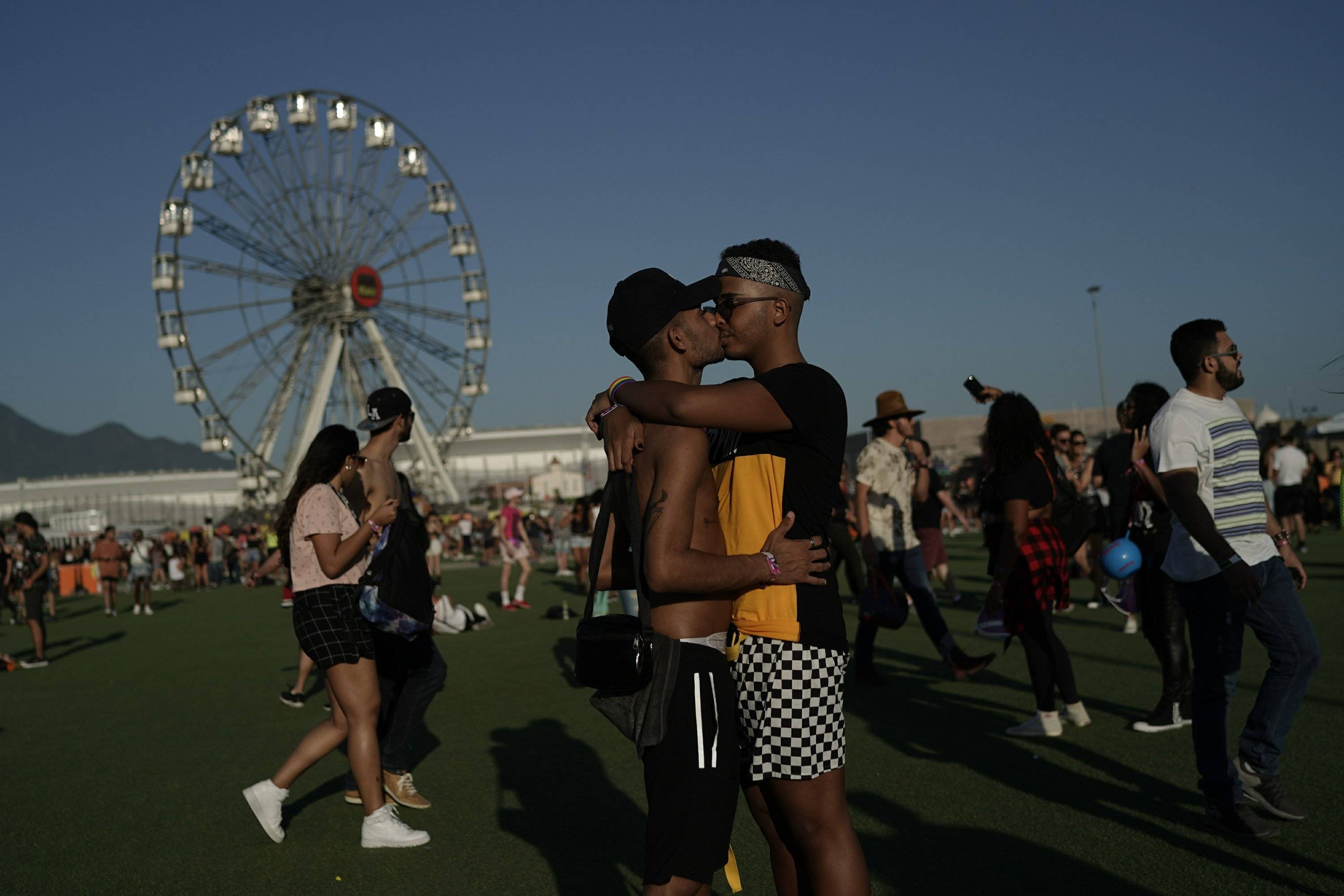 En esta imagen del 5 de octubre de 2019, dos hombres se besan mientras posan para una fotografía en el festival musical Rock in Río, en Río de Janeiro, Brasil. (AP Foto/Leo Correa)