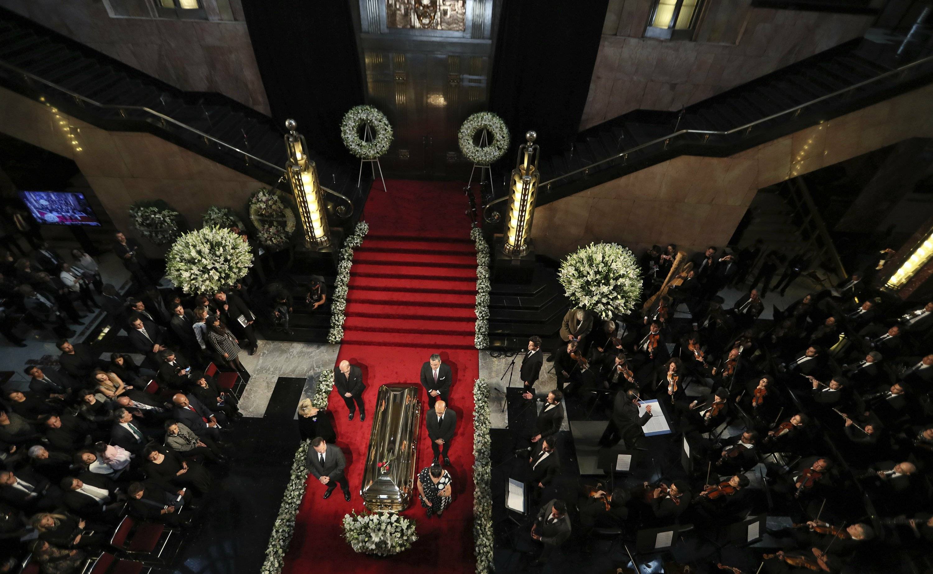 En esta imagen del 9 de octubre de 2019, varias personas permanecen de pie junto al féretro del cantante mexicano José José durante un homenaje en el Palacio de Bellas Artes de la Ciudad de México. José José falleció el 28 de septiembre en Florida. Su cuerpo fue cremado en Miami y se acordó, después de una disputa entre familiares, que la mitad de sus cenizas permanecerían allá y la otra mitad sería enviada a México. (AP Foto/Fernando Llano)