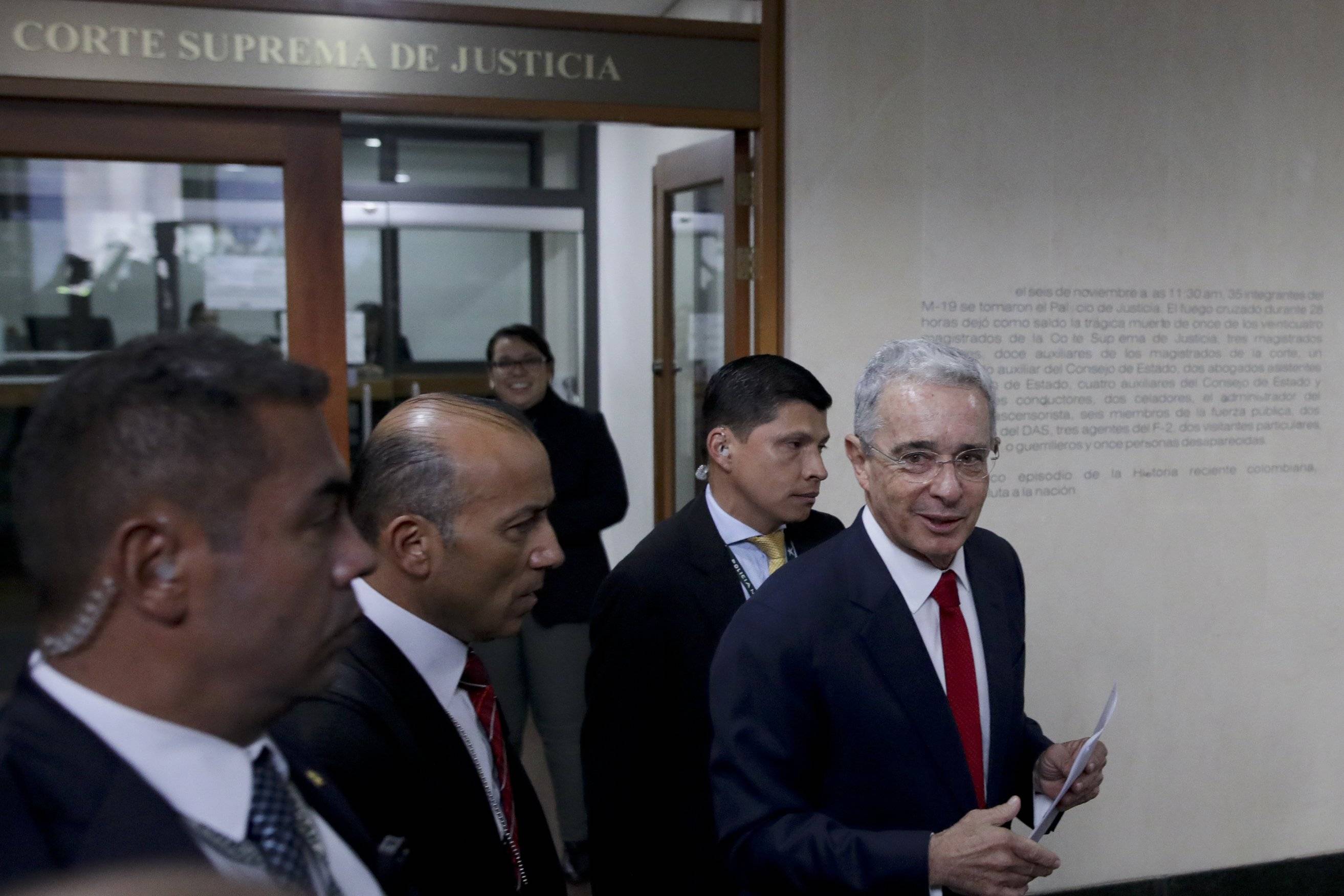 En esta imagen del 8 de octubre de 2019, el expresidente de Colombia Álvaro Úribe llega a la Suprema Corte para ser interrogado en un caso de manipulación de testigos, en Bogotá, Colombia. Se anticipaba que un magistrado cuestionara a Uribe a puerta cerrada sobre las acusaciones de que, por medio de un abogado, intentó influenciar e incluso sobornar a miembros de un grupo paramilitar que tenían información en su contra. (AP Foto/Iván Valencia)