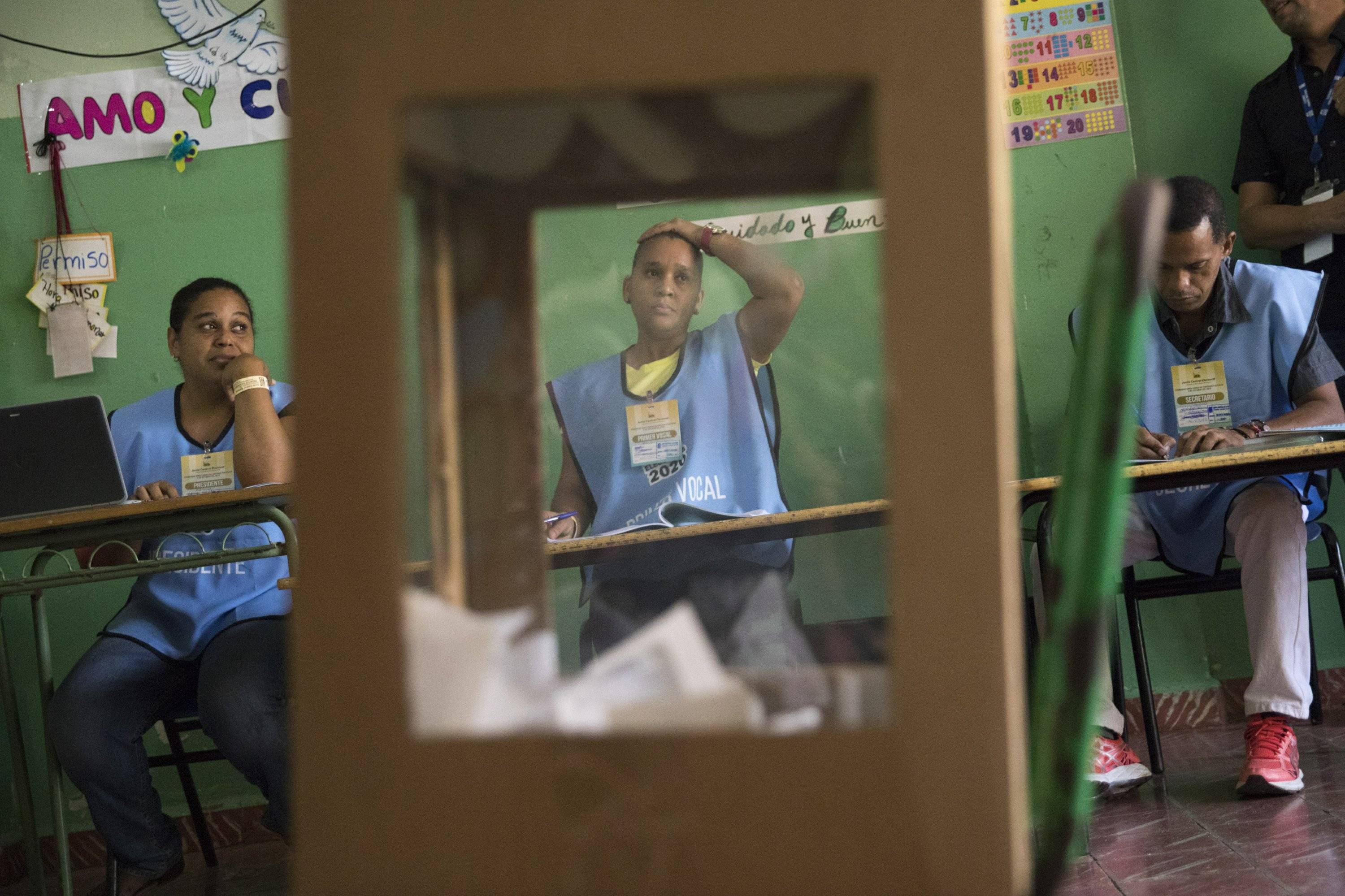 En esta imagen del 6 de octubre de 2019, captada a través de una urna de votación, trabajadores electorales aguardan a los votantes durante las elecciones presidenciales primarias en Santo Domingo, República Dominicana. La República Dominicana celebrará su elección presidencial el 16 de mayo de 2020. (AP Foto/Tatiana Fernández)