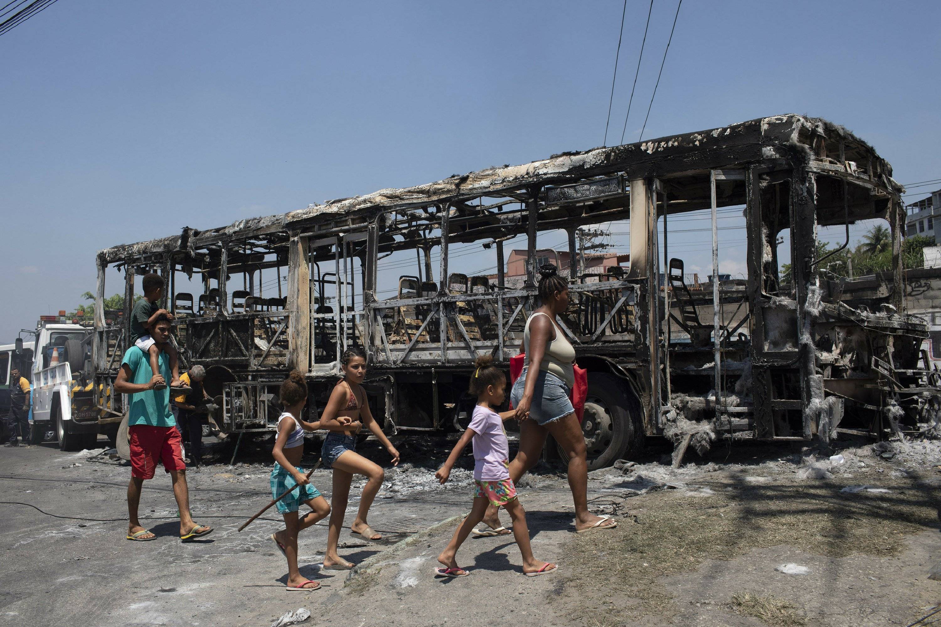 En esta imagen del 4 de octubre de 2019, una familia camina frente a los restos de un autobús que fue incendiado durante las confrontaciones nocturnas en el vecindario de Costa Barros en Río de Janeiro, Brasil. Una disputa armada por territorio entre grupos delictivos rivales la noche anterior dejó siete autobuses en llamas, al menos tres personas muertas y seis heridas, confirmaron las autoridades. (AP Foto/Silvia Izquierdo)