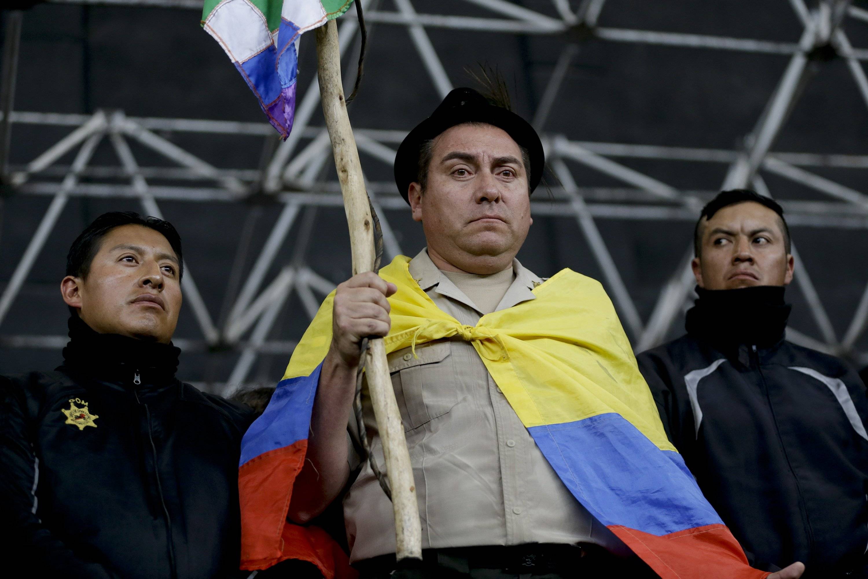 En esta imagen del 10 de octubre de 2019, el coronel Cristian Rueda Ramos, uno de varios agentes de policía que fueron detenidos por manifestantes antigubernamentales, es forzado a sostener un banderín indígena, a utilizar la bandera nacional como capa y portar un sombrero, mientras se le presenta en un escenario de la Casa de Cultura en Quito, Ecuador. Los manifestantes en contra del gobierno han forzado a los agentes cautivos a desfilar sobre el escenario, en un abierto desafío a las autoridades que buscan un diálogo con la oposición, en particular los grupos indígenas, después del descontento provocado por el alza en los precios de los combustibles. (AP Foto/Fernando Vergara)