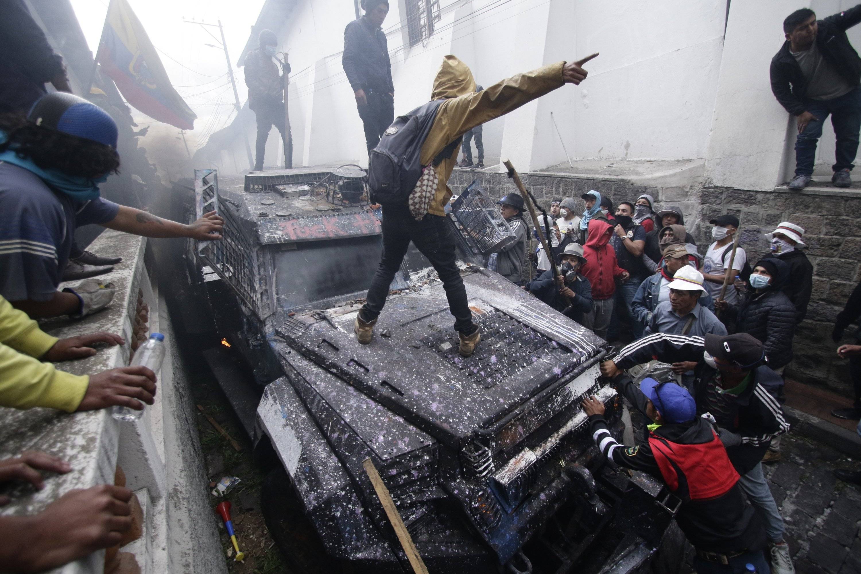 En esta imagen del 9 de octubre de 2019, un vehículo del ejército avanza hacia manifestantes antigubernamentales durante una huelga nacional en contra del presidente Lenín Moreno y sus políticas económicas en Quito, Ecuador. Los enormes incrementos a los precios de los combustibles después de que el gobierno eliminó la semana pasada los subsidios han generado un caos en Ecuador, donde se registran protestas, saqueos, actos de vandalismo, enfrentamientos con los cuerpos de seguridad, bloqueos de carreteras y la suspensión de parte de su vital industria petrolera. (AP Foto/Dolores Ochoa)