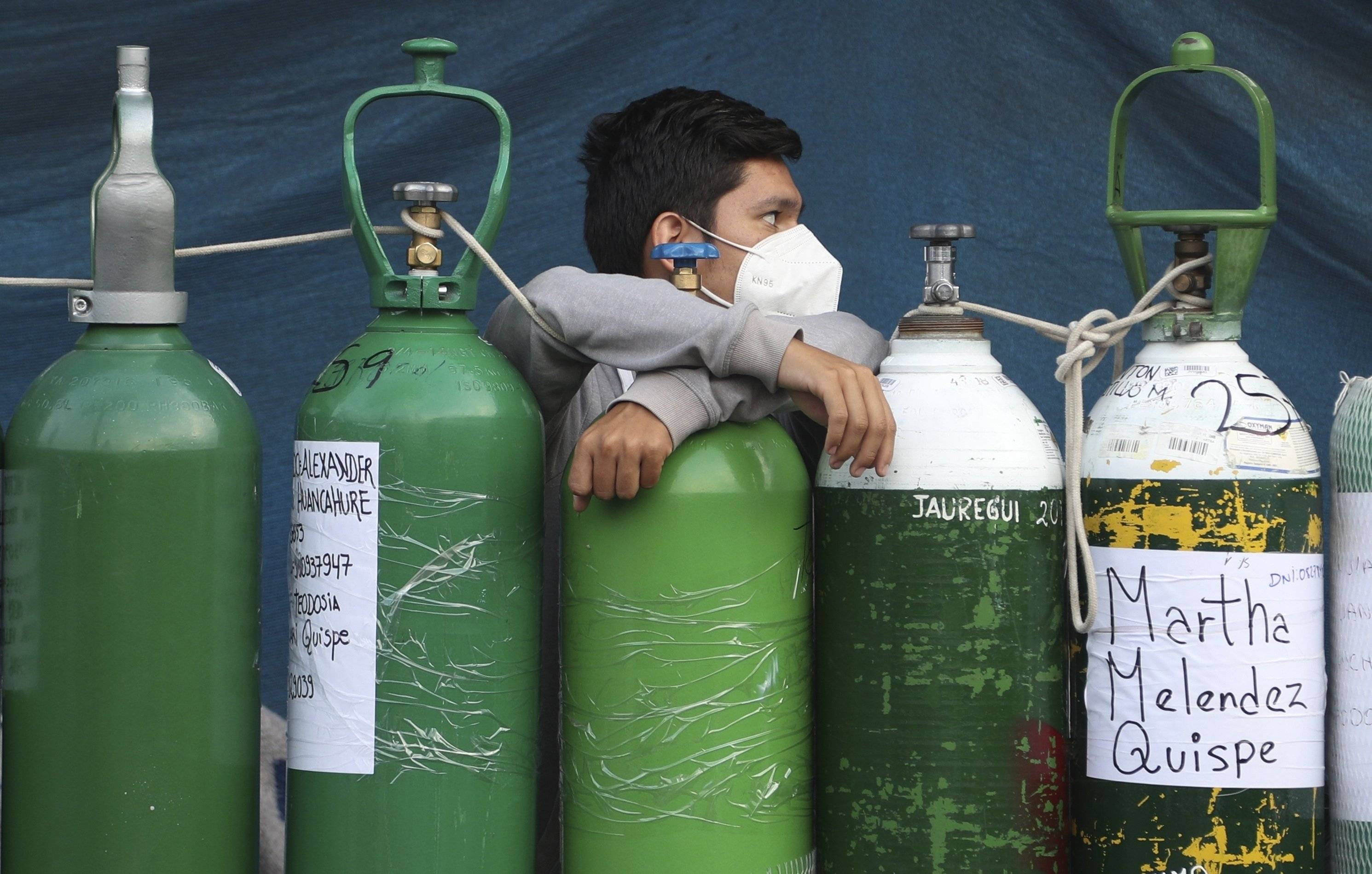 Un joven descansa apoyado sobre una bombona de oxígeno vacía mientras espera a rellenarla en un establecimiento en el vecindario de San Juan de Lurigancho, en Lima, Perú, el 22 de febrero de 2021, mientras continúa la escasez de oxígeno médico para tratar a los pacientes de COVID-19 en el país. La tienda solo puede rellenar unos 40 tanques al día, lo que provoca largas filas en el exterior de los proveedores privados, con muchos pasando la noche al raso para no perder su puesto. (AP Foto/Martín Mejía)