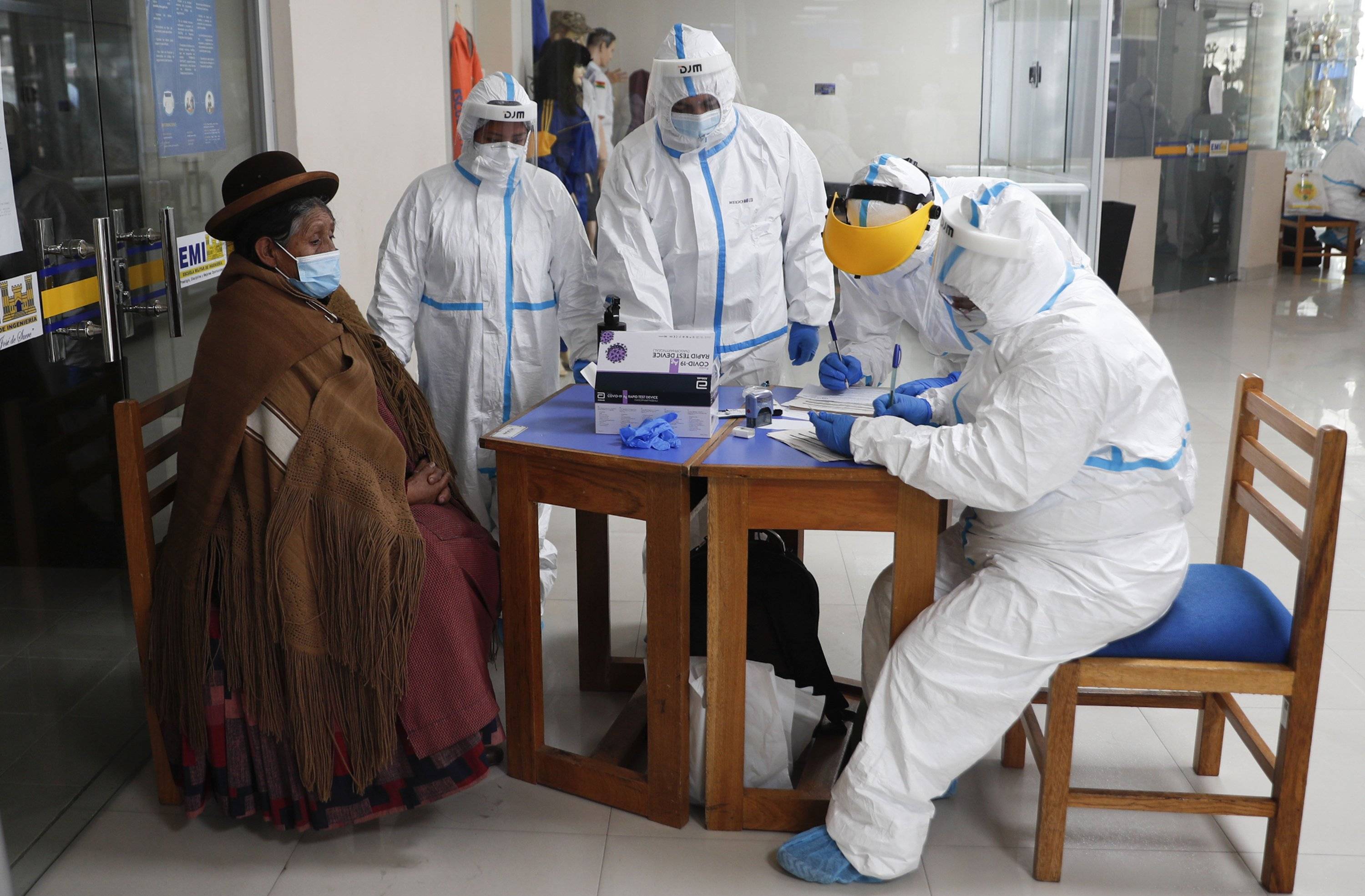 Trabajadores de salud toman los datos de una mujer antes de una prueba para diagnosticar el coronavirus, en la Escuela Militar de Ingeniería de La Paz, Bolivia, el 21 de febrero de 2021. (AP Foto/Juan Karita)