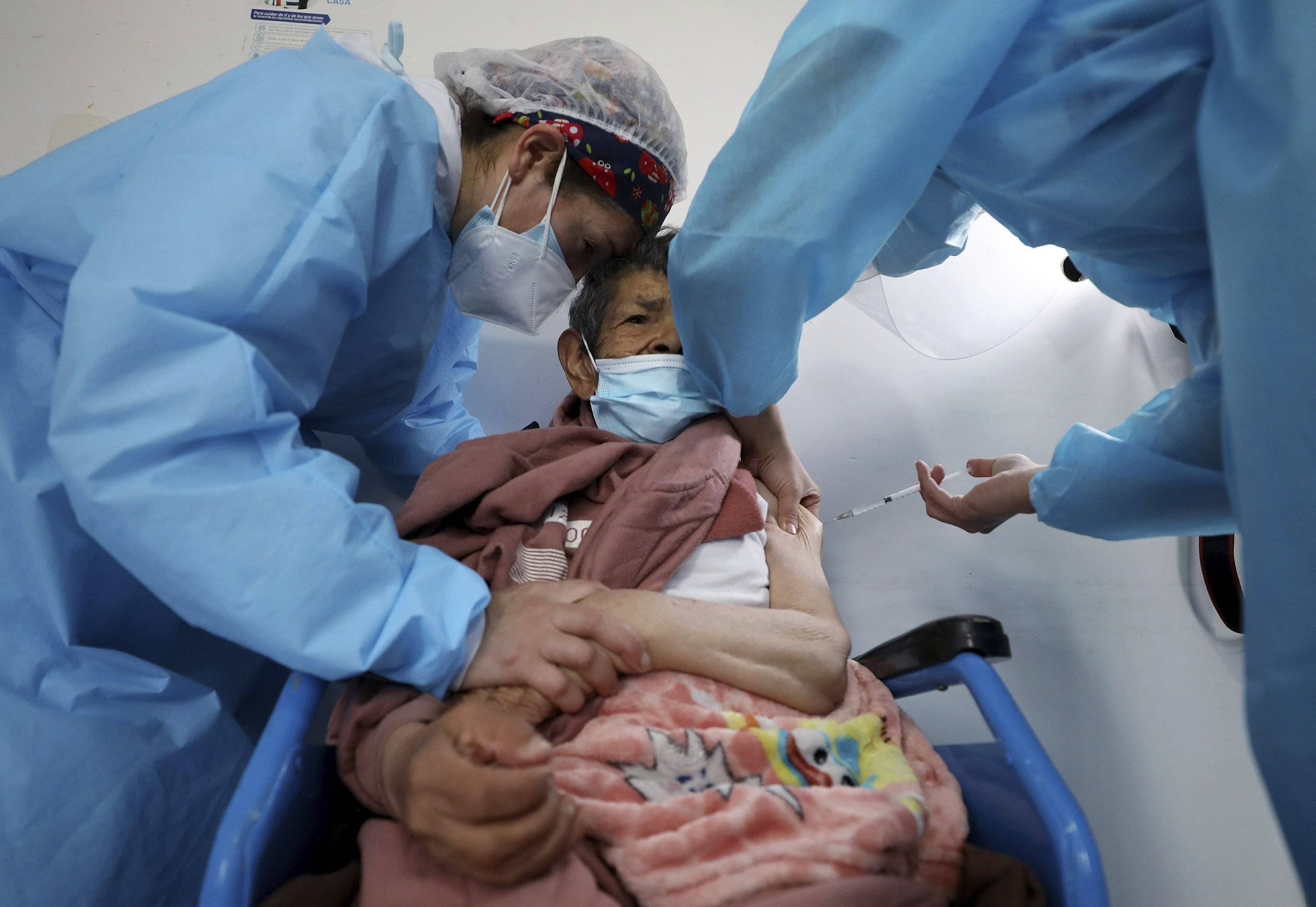 Una mujer mayor recibe una dosis de la vacuna CoronaVac, desarrollada por la farmacéutica china Sinovac Biotech. en el centro femenino especial José Joaquín Vargas, en Sibate, Colombia, el 24 de febrero de 2021. El centro geriátrico, especializado en el tratamiento de mujeres con problemas psicológicos, comenzó a vacunar a pacientes de más de 80 años contra el coronavirus. (AP Foto/Fernando Vergara)
