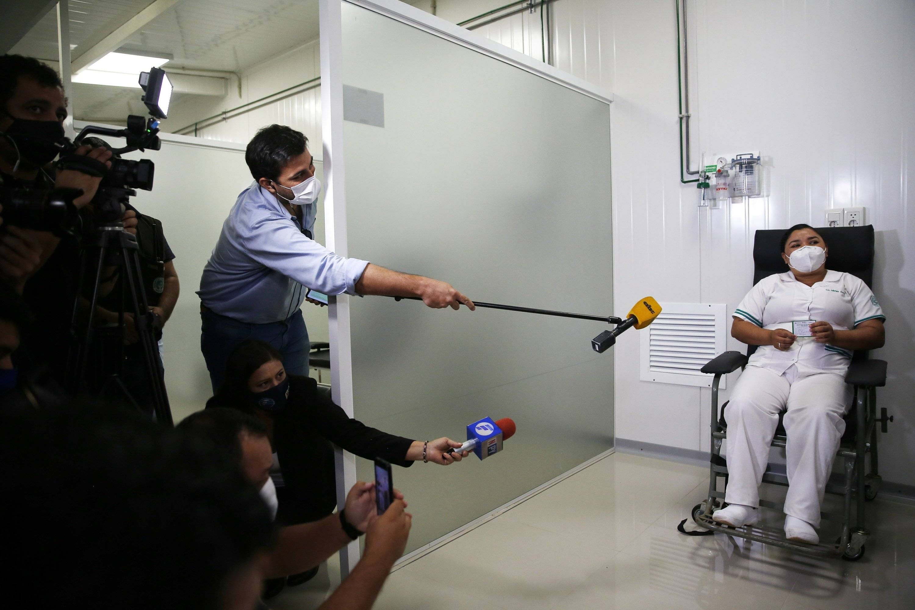 La enfermera Mirian Arrua habla con reporteros antes de recibir la primera dosis de la vacuna rusa Sputnik V contra el COVID-19 en el país, administrada por el ministro de Salud, Julio Mazzoleni (no fotografiado) en el Hospital Nacional, en Itaugua, Paraguay, el 22 de febrero de 2021. (AP Foto/Jorge Sáenz)