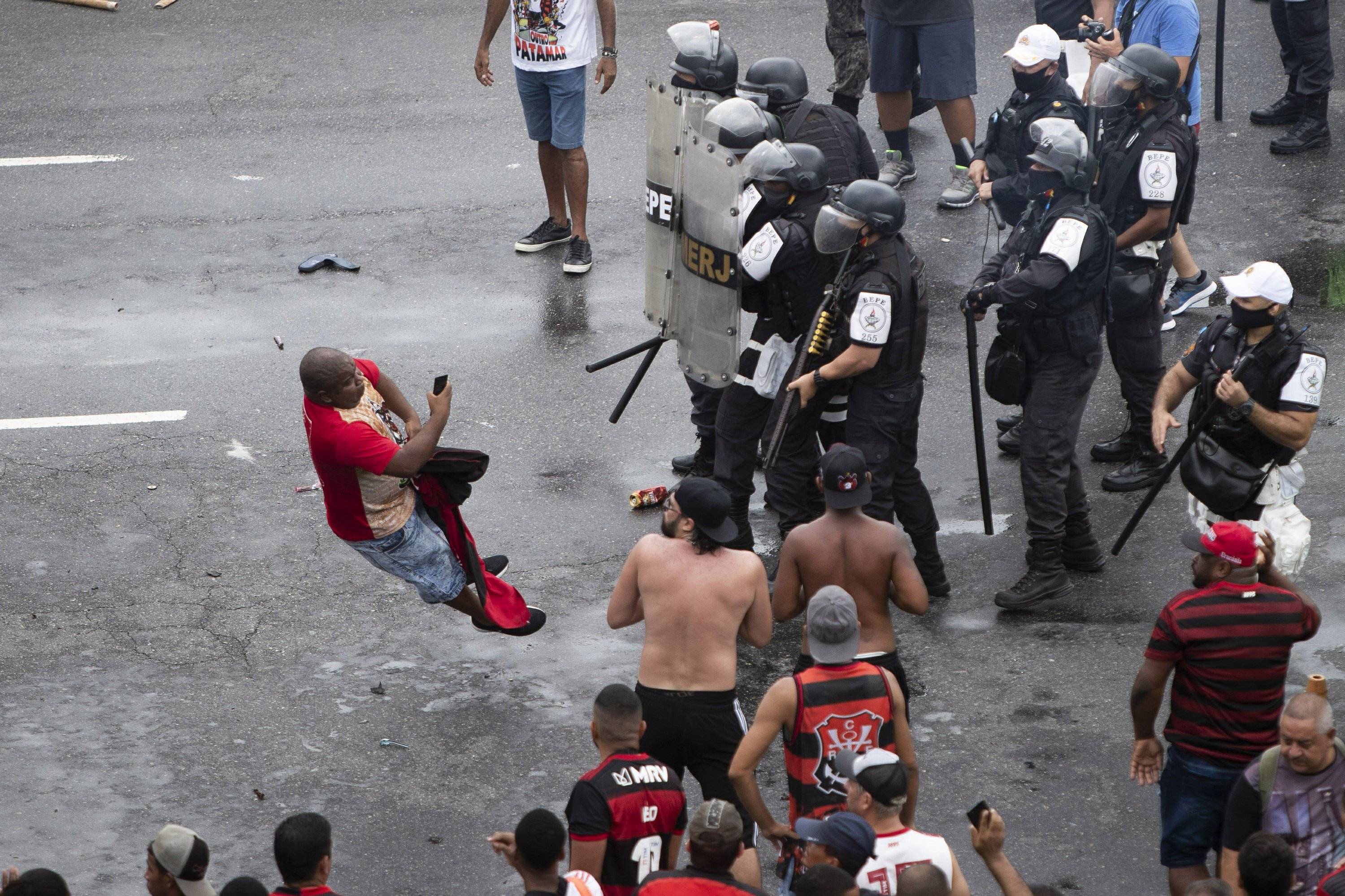 Agentes de policía hacen retroceder a un aficionado de Flamengo durante los disturbios registrados a la llegada del equipo a un partido contra Internacional por la penúltima ronda del campeonato de Brasil, en el estadio de Maracaná, en Río de Janeiro, Brasil, el 21 de febrero de 2021. Internacional perdió y Flamengo quedó mejor posicionado para ganar el título. (AP Foto/Bruna Prado)