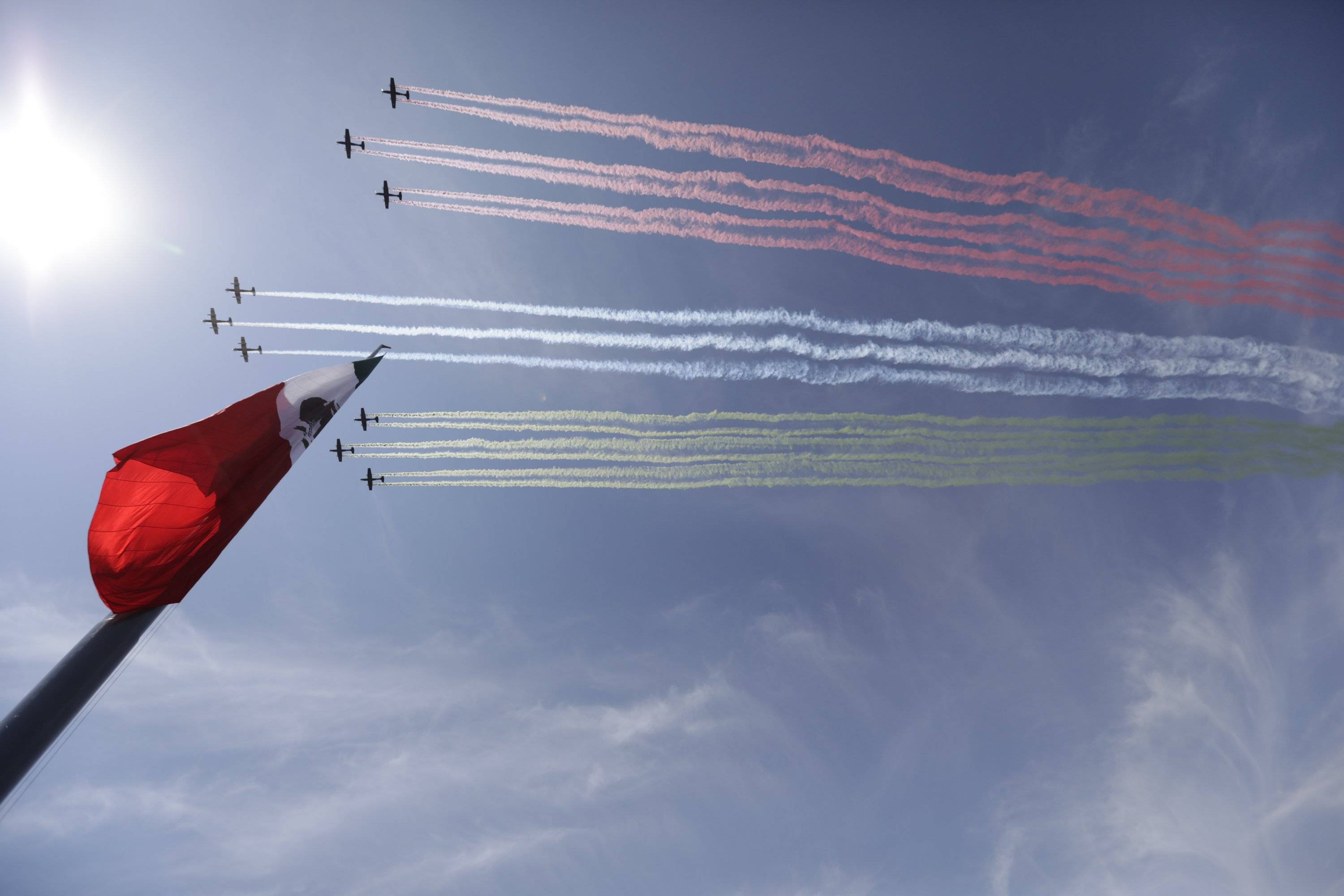 Aviones de la Fuerza Aérea vuelan en formación sobre una bandera mexicana del presidente del país, Andrés Manuel López Obrador, y su homólogo argentino, Alberto Fernández, a Iguala para conmemorar el día de la bandera, en México, el 24 de febrero de 2021. (AP Foto/Eduardo Verdugo)
