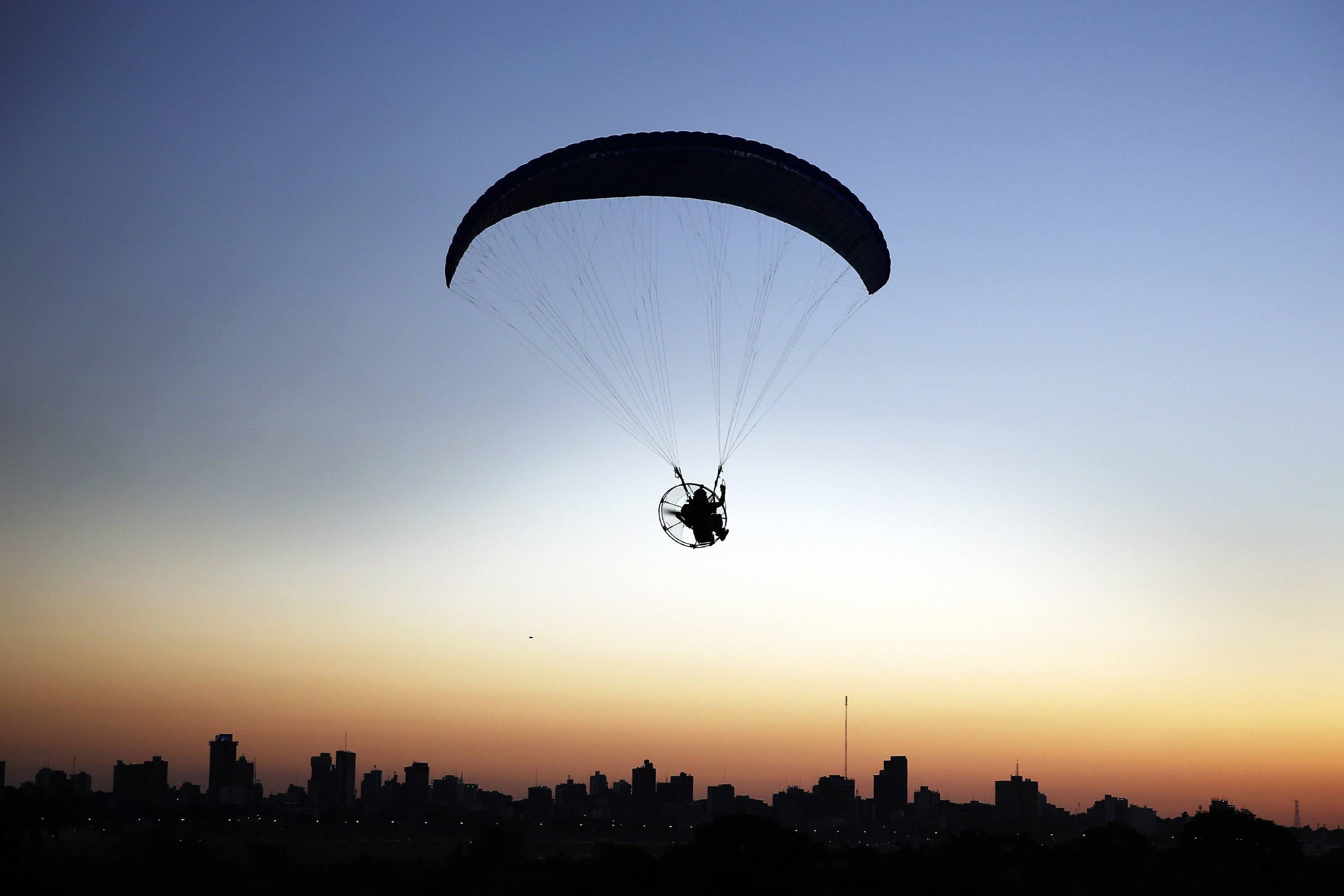 Un hombre vuela en un parapente motorizado sobre Costanera de Asunción, en Paraguay, el 21 de febrero de 2021. (AP Foto/Jorge Sáenz)